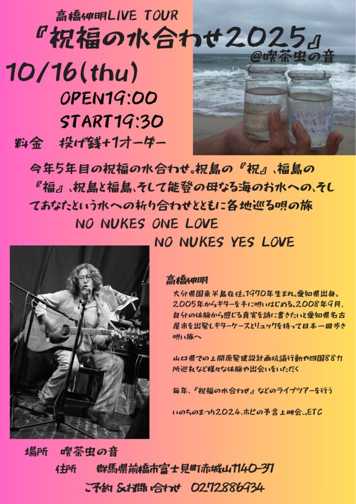 « イベント一覧 このイベントは終了しました。 10月16日(木)高橋伸明ライブ【祝福の水合わせ2025】@喫茶虫の音 10月 16日 @ 7:00 PM - 10:30 PM « 釜ヶ崎SONIC2025 2日目 10月17日(金)山本久土ライブ 山本久土 蛸-カイト- 高平悠 » 10月16日(木)高橋伸明ライブ 19時開場 19時半スタート 投げ銭+1オーダー 入場無料 小さなお子様も大歓迎! 皆さまお誘い合わせてお越し下さい😊 + Google カレンダー+ iCal エクスポート 詳細 日付: 10月 16日 時間: 7:00 PM - 10:30 PM この投稿へのコメント コメントはありません。 コメントを残す コメントをキャンセルメールアドレスが公開されることはありません。 ※ が付いている欄は必須項目ですコメント ※ 名前 ※ メール ※ サイト 次回のコメントで使用するためブラウザーに自分の名前、メールアドレス、サイトを保存する。