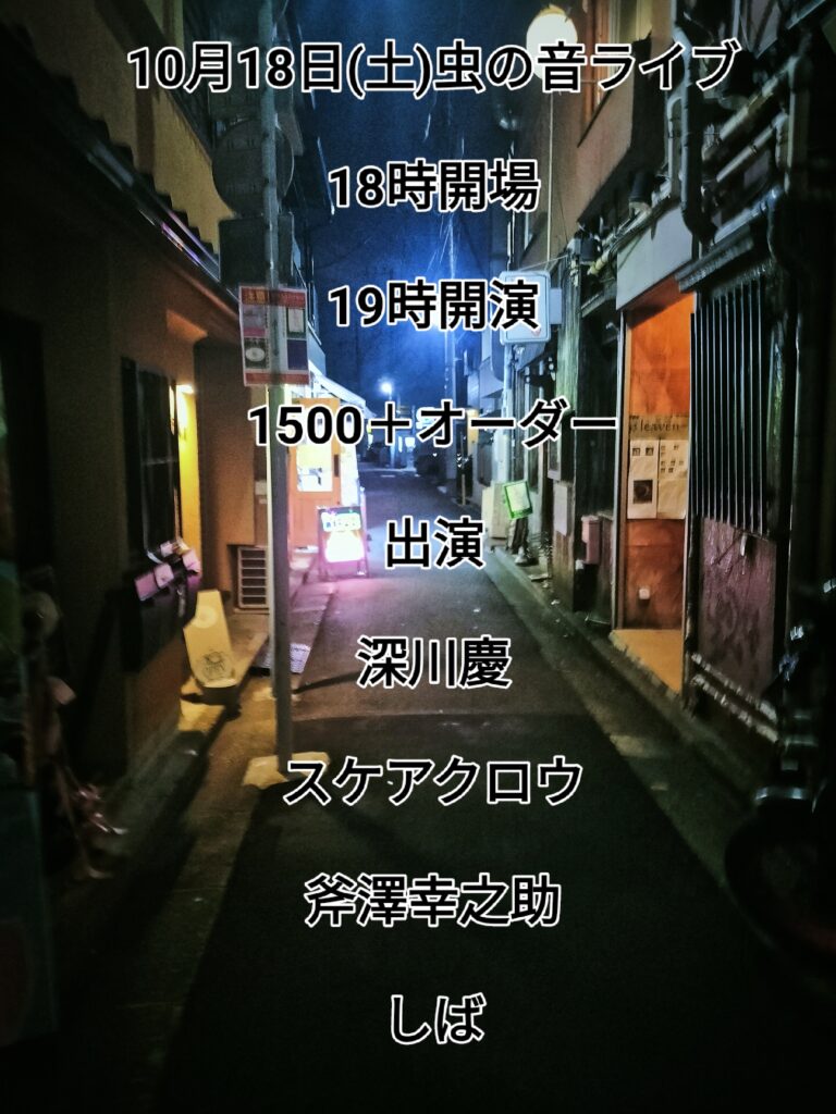 « イベント一覧 このイベントは終了しました。 10月18日(土)深川慶 スケアクロウ 斧澤幸之助 しば 10月 18日 @ 6:00 AM - 11:00 PM « 10月17日(金)山本久土ライブ 山本久土 蛸-カイト- 高平悠 10月19日(日)虫の音ライブ miti マッチボックス 佐倉小路紫 チバーラ » 10月18日(土)虫の音ライブ 18時開場 19時開演 1500+オーダー 出演 深川慶 スケアクロウ 斧澤幸之助 しば + Google カレンダー+ iCal エクスポート 詳細 日付: 10月 18日 時間: 6:00 AM - 11:00 PM この投稿へのコメント コメントはありません。 コメントを残す コメントをキャンセルメールアドレスが公開されることはありません。 ※ が付いている欄は必須項目ですコメント ※ 名前 ※ メール ※ サイト 次回のコメントで使用するためブラウザーに自分の名前、メールアドレス、サイトを保存する。