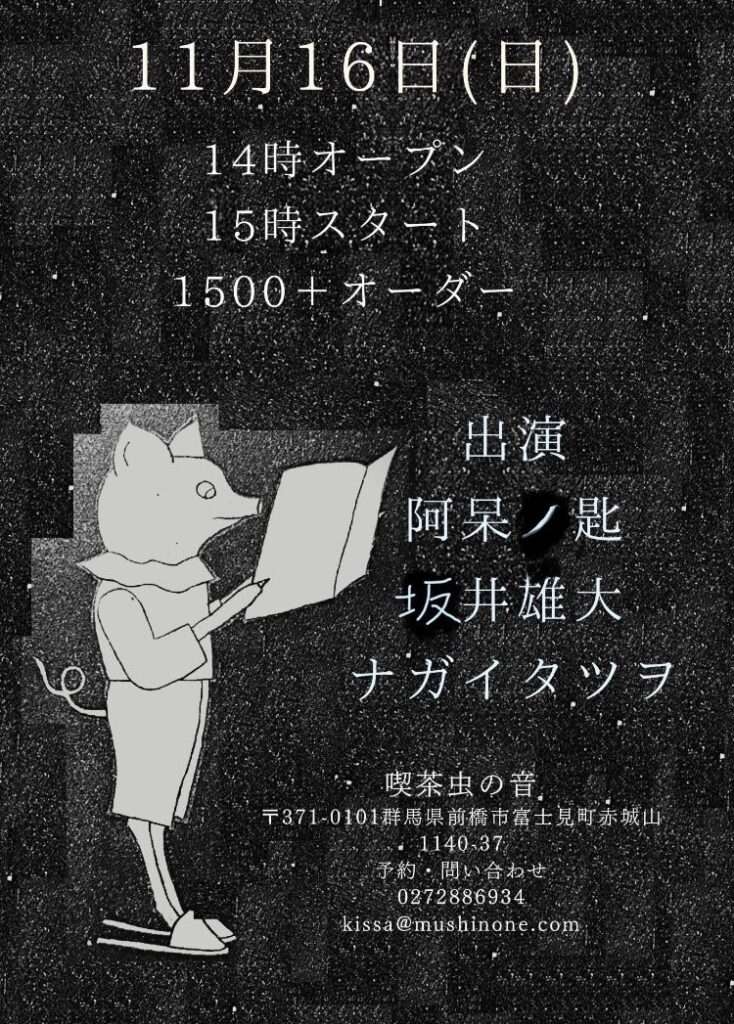 « イベント一覧 このイベントは終了しました。 11月16日(日)阿呆ノ匙 坂井雄大 ナガイタツヲ 11月 16日 @ 2:00 PM - 6:00 PM « サトチエライブ情報 11月8日(土)『戦争80』@鶴岡大鳥 ラ・ベジューサ サトチエ 11月22日(土)『としとめ展オープニングパーティー』 » 11月16日(日) 他 14時オープン 15時スタート 1500+オーダー 出演 阿呆ノ匙 坂井雄大 ナガイタツヲ + Google カレンダー+ iCal エクスポート 詳細 日付: 11月 16日 時間: 2:00 PM - 6:00 PM この投稿へのコメント コメントはありません。 コメントを残す コメントをキャンセルメールアドレスが公開されることはありません。 ※ が付いている欄は必須項目ですコメント ※ 名前 ※ メール ※ サイト 次回のコメントで使用するためブラウザーに自分の名前、メールアドレス、サイトを保存する。