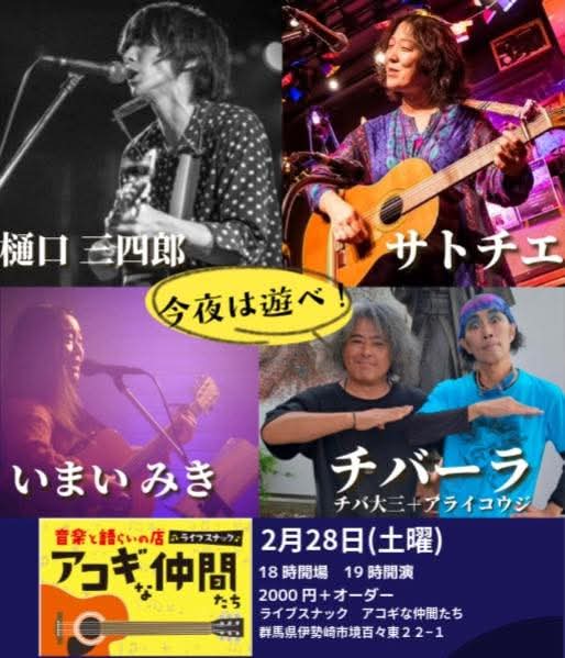 « イベント一覧 2月28日(土)今夜は遊べ!@伊勢崎アコギな仲間たち 2月 28日 @ 6:00 AM - 10:00 PM « 休み 3月7日(土)マッチのひなまつり企画だぜ!ライブ@赤城山虫の音 » 2月28日(土)今夜は遊べ! @伊勢崎アコギな仲間たち 18時開場 19時スタート 2000円+オーダー 出演 樋口三四郎 いまいみき チバーラ(チバ大三+アライコウジ) サトチエ + Google カレンダー+ iCal エクスポート 詳細 日付: 2月 28日 時間: 6:00 AM - 10:00 PM この投稿へのコメント コメントはありません。 コメントを残す コメントをキャンセルメールアドレスが公開されることはありません。 ※ が付いている欄は必須項目ですコメント ※ 名前 ※ メール ※ サイト 次回のコメントで使用するためブラウザーに自分の名前、メールアドレス、サイトを保存する。
