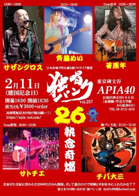 2/11(木祝)碑文谷APIA40『独唱パンクvol.257 26執念奇燃』