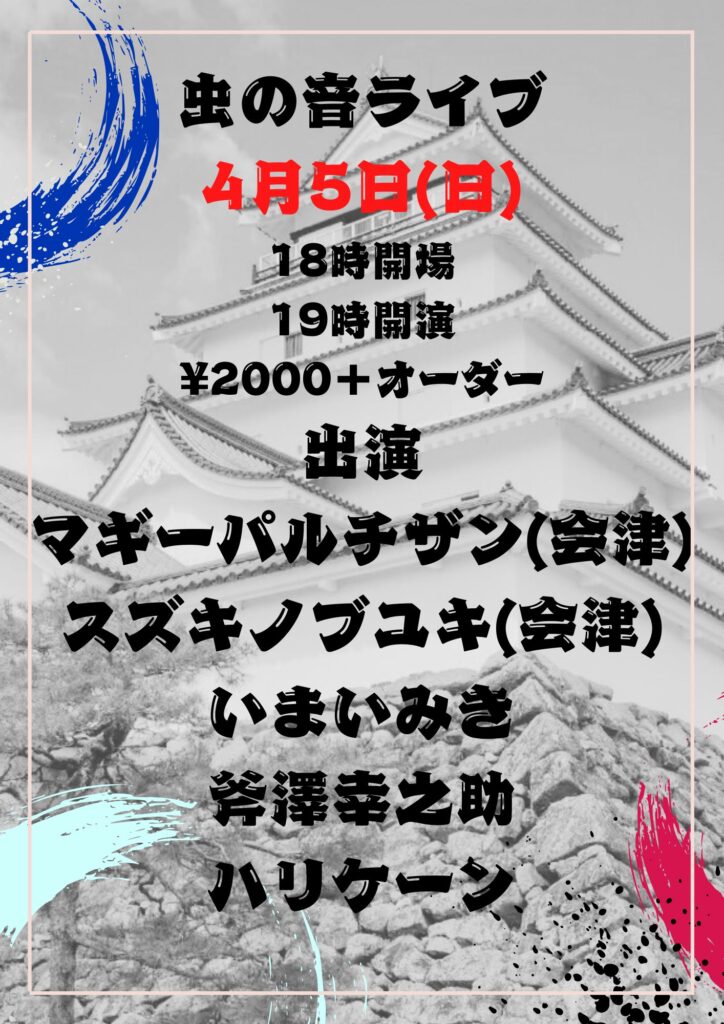 « イベント一覧 4月5日(日) マギーパルチザン スズキノブユキ いまいみき ハリケーン 斧澤幸之助 4月 5日 @ 6:00 PM - 11:00 PM « 4月4日(土) 犬風 イツカミモザ さよならカンパニー ヨシノビ 橋爪ひとり 4月9日(木) 「山本久土ライブ」 山本久土 カイト-蛸-+サイトウシュン » 4月5日(日) 18時オープン 19時スタート 2000円+オーダー 出演 マギーパルチザン(会津) スズキノブユキ(会津) いまいみき ハリケーン 斧澤幸之助 + Google カレンダー+ iCal エクスポート 詳細 日付: 4月 5日 時間: 6:00 PM - 11:00 PM この投稿へのコメント コメントはありません。 コメントを残す コメントをキャンセルメールアドレスが公開されることはありません。 ※ が付いている欄は必須項目ですコメント ※ 名前 ※ メール ※ サイト 次回のコメントで使用するためブラウザーに自分の名前、メールアドレス、サイトを保存する。