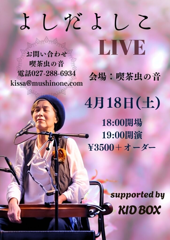 « イベント一覧 4月18日(土)よしだよしこライブ 4月 18日 @ 6:00 PM - 10:00 PM « 4月11日(土)虫の音ライブ 長津宏文(札幌) シラフ(千葉) サワダヒロアキ ヒロミーツ 4月26日(日) 少年タイチ カトウトモヒサ 試作3号機 酔醒 » 4月18日(土)「よしだよしこライブ」 会場:赤城山喫茶虫の音 18:00開場 19:00開演 ¥3500+オーダー supported by KID BOX ご予約受け付けております。 https://mushinone.com/contact/ + Google カレンダー+ iCal エクスポート 詳細 日付: 4月 18日 時間: 6:00 PM - 10:00 PM この投稿へのコメント コメントはありません。 コメントを残す コメントをキャンセルメールアドレスが公開されることはありません。 ※ が付いている欄は必須項目ですコメント ※ 名前 ※ メール ※ サイト 次回のコメントで使用するためブラウザーに自分の名前、メールアドレス、サイトを保存する。