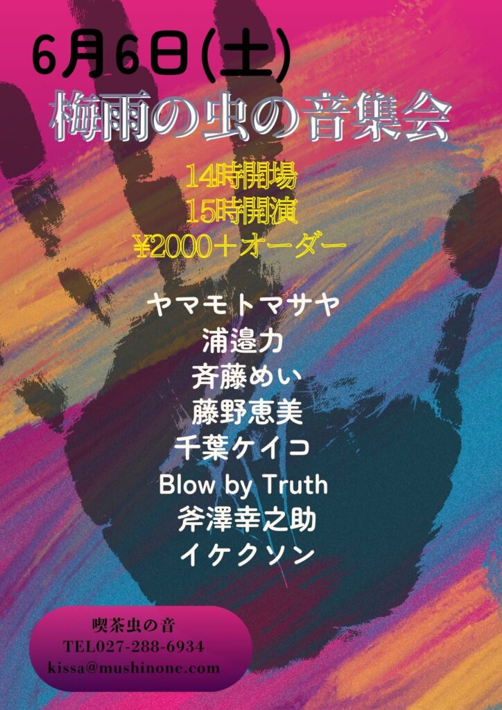 « イベント一覧 6月6日(土) 「梅雨の虫の音集会」 6月 6日 @ 2:00 PM - 9:00 PM « 【サトチエライブ情報】6月5日(金)「エレピな仲間たち+1」藤野恵美 千葉ケイコ 中澤田たかし&Eri サトチエ 6月28日(日)井山あきのり初夏の関東ブギウギツアーwithフォーク者イサジ式 supported by KID BOX » 6月6日(土) 「梅雨の虫の音集会」 14時開場 15時開演 ¥2000+オーダー 出演 ヤマモトマサヤ 浦邉力 斉藤めい 藤野恵美 千葉ケイコ イケクソン 斧澤幸之助 Blow by Truth + Google カレンダー+ iCal エクスポート 詳細 日付: 6月 6日 時間: 2:00 PM - 9:00 PM この投稿へのコメント コメントはありません。 コメントを残す コメントをキャンセルメールアドレスが公開されることはありません。 ※ が付いている欄は必須項目ですコメント ※ 名前 ※ メール ※ サイト 次回のコメントで使用するためブラウザーに自分の名前、メールアドレス、サイトを保存する。